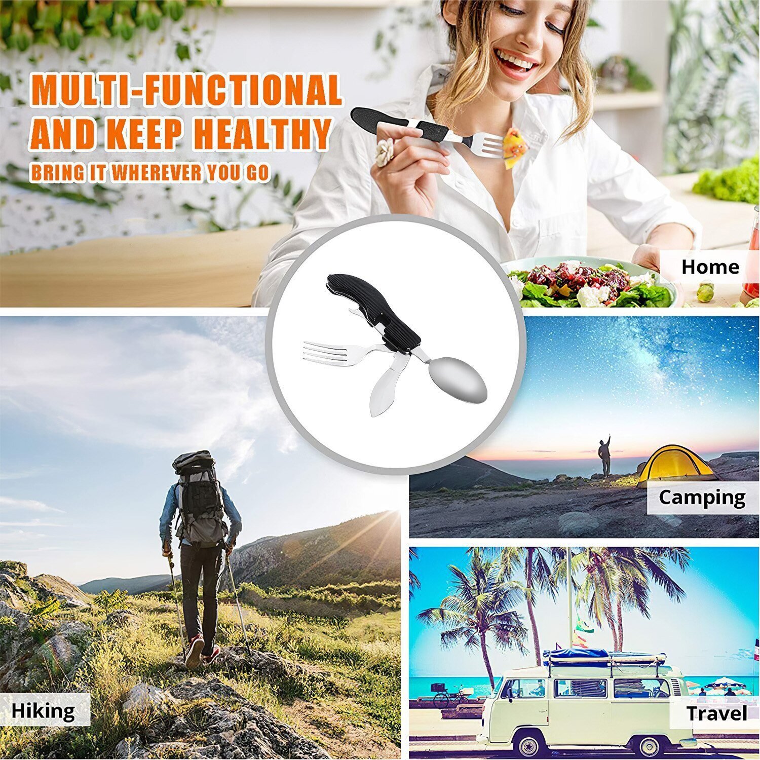1.Make eating out in the wild simple. This camping flatware tool lets you easily scoop, cut, and spear your meals. Plus, it fits perfectly in your pack or pocket.