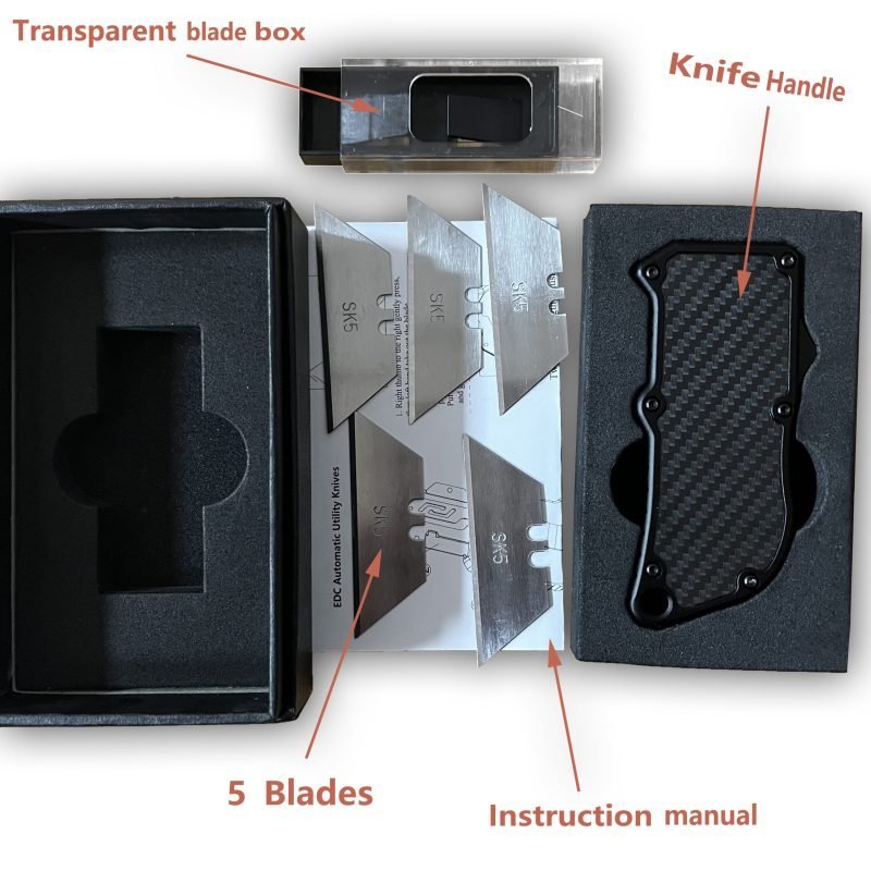 Description: This small Out The Front utility knife fits in a pocket, removes the replacement blade, and comes in a beautiful gift box. It has an excellent safety device to keep the blade from dropping in any situation, and the handle is made of carbon fiber material, making it smoother in the hand.